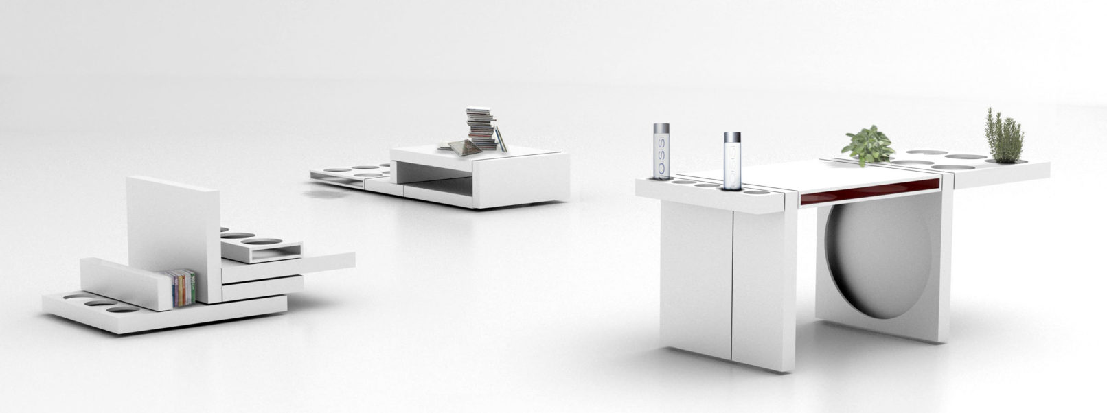 Il progetto persegue una semplice idea di assemblaggio e composizione di moduli, con l’obiettivo di ottenere una nuova concezione di tavolo, sempre riconfigurabile ed estendibile. Il tema del tavolo è centrale nella definizione degli spazi domestici; esso rappresenta un elemento d’arredo a cui sono consentiti pochi gradi di flessibilità, all’interno delle nostre abitazioni: nella migliore delle ipotesi può raddoppiare le proprie dimensioni, ma quasi mai gode della possibilità di adattarsi a differenti esigenze funzionali. Il progetto ALFA001 consente di ottenere innumerevoli scenari, partendo dai sei moduli del KIT base, differenti per dimensione e per tipologia. I sei elementi di partenza rappresentano la dotazione minima per ottenere delle tipologie più semplici. L’aggiunta di moduli può procedere indistintamente (2, 3 o più kit base), così da comporre sistemi sempre più complessi, fino ad ottenere quello che abbiamo definito un tavolo infinito.