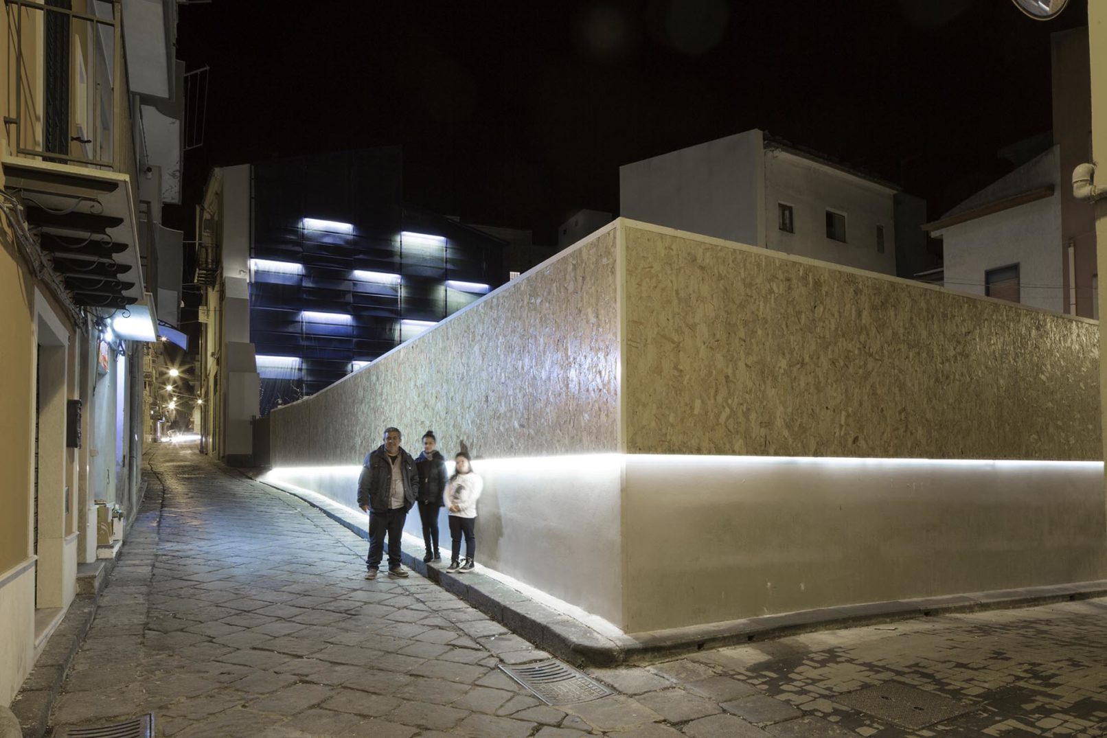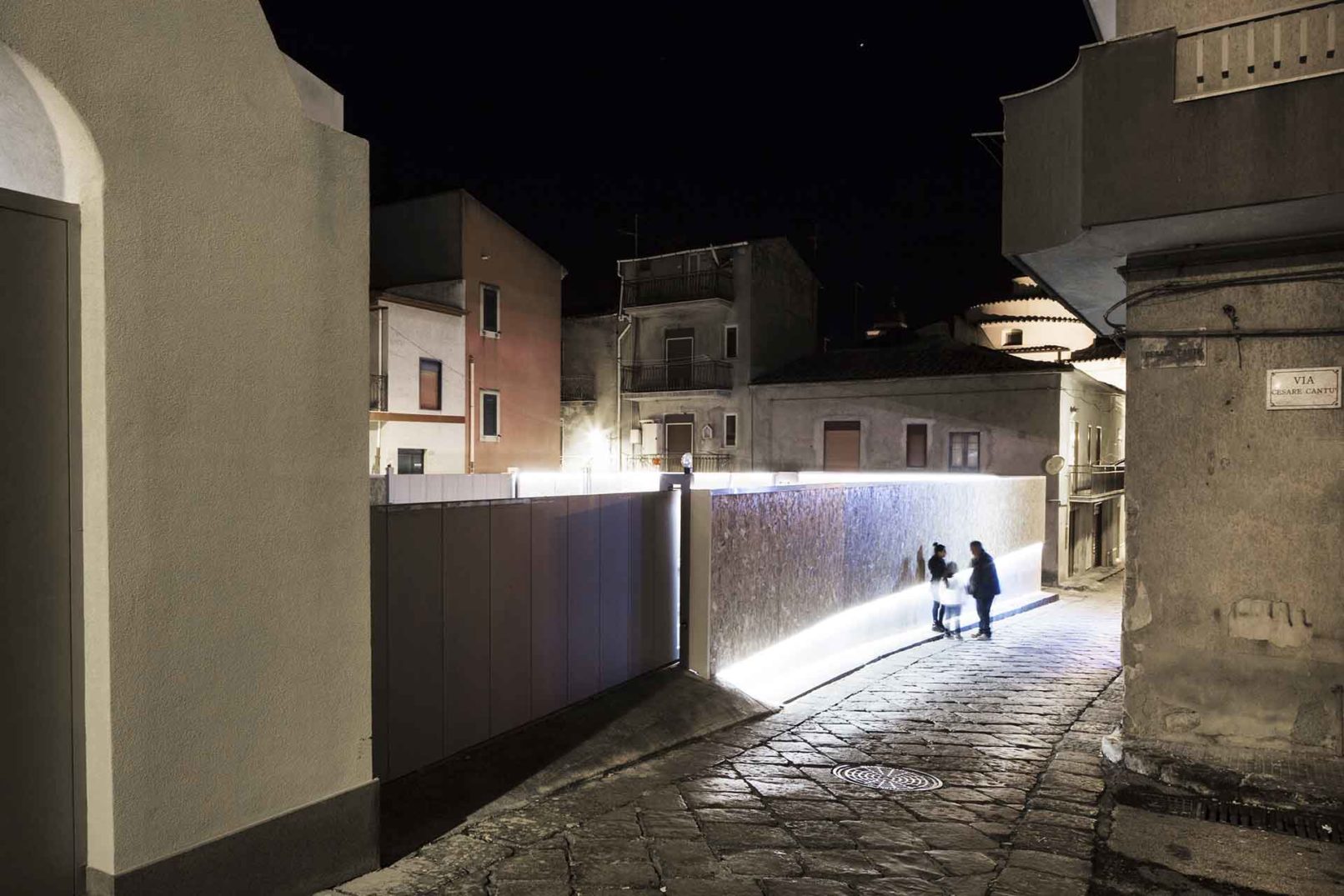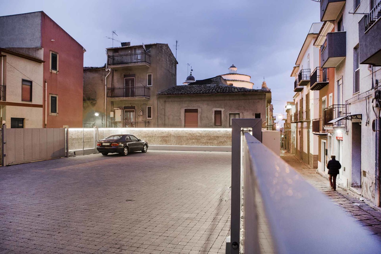Il parcheggio per la B.C.C. “G.Toniolo” di San Cataldo rientra nel quadro degli interventi promossi dalla committenza a partire dal 2007, tra cui la ristrutturazione della sua sede, la riqualificazione dell’antistante piazza e la realizzazione del nuovo auditorium. La superficie del parcheggio è stata ricavata dalla demolizione di edifici fatiscenti e ha generato un insolito vuoto urbano nel tessuto storico di San Cataldo. Il progetto realizzato con materiali semplici si compone di un recinto a perimetro degli originali edifici e di una facciata logo, realizzata con pannelli di acciaio che si trasforma in una superficie luminosa durante la notte, unitamente al recinto perimetrale.