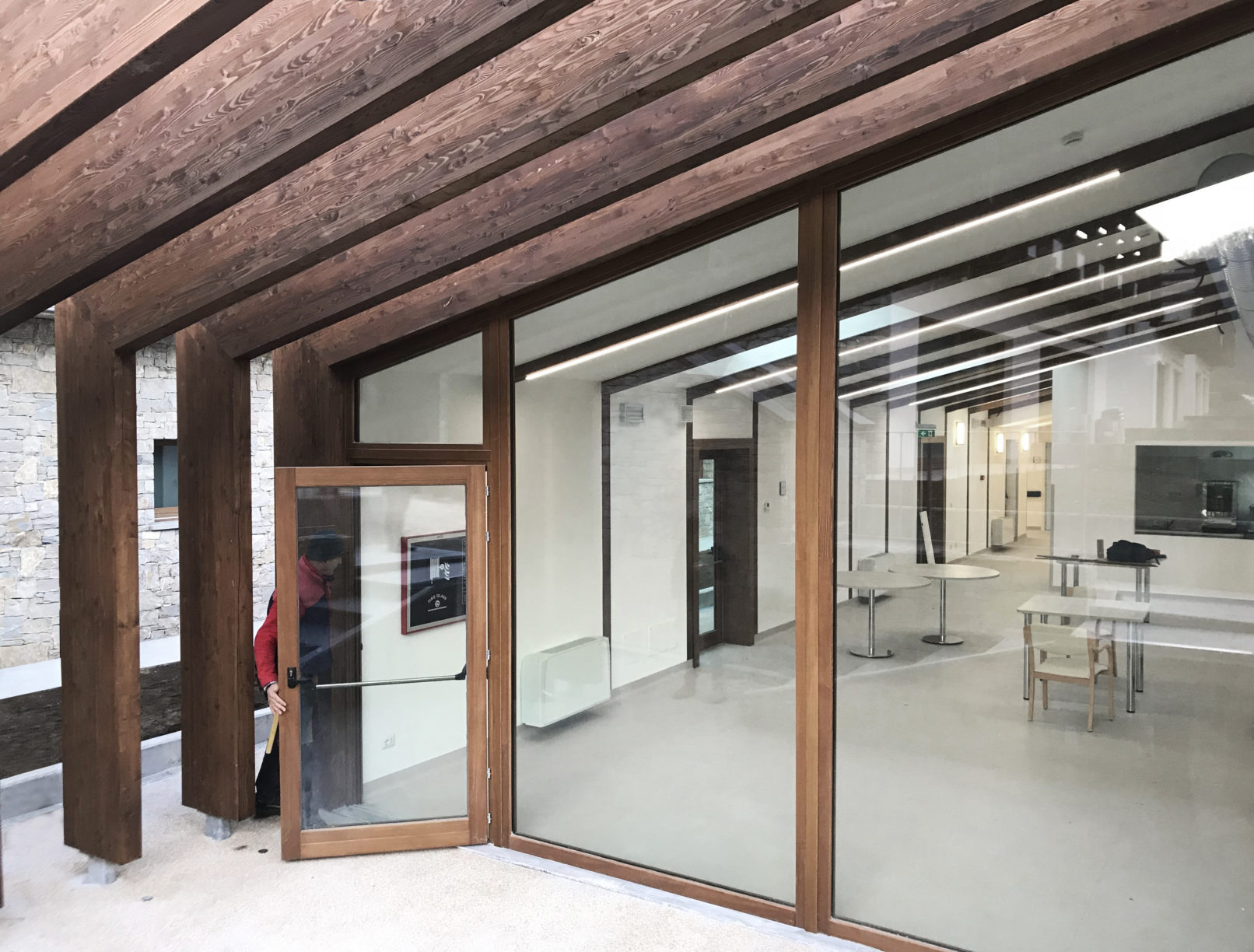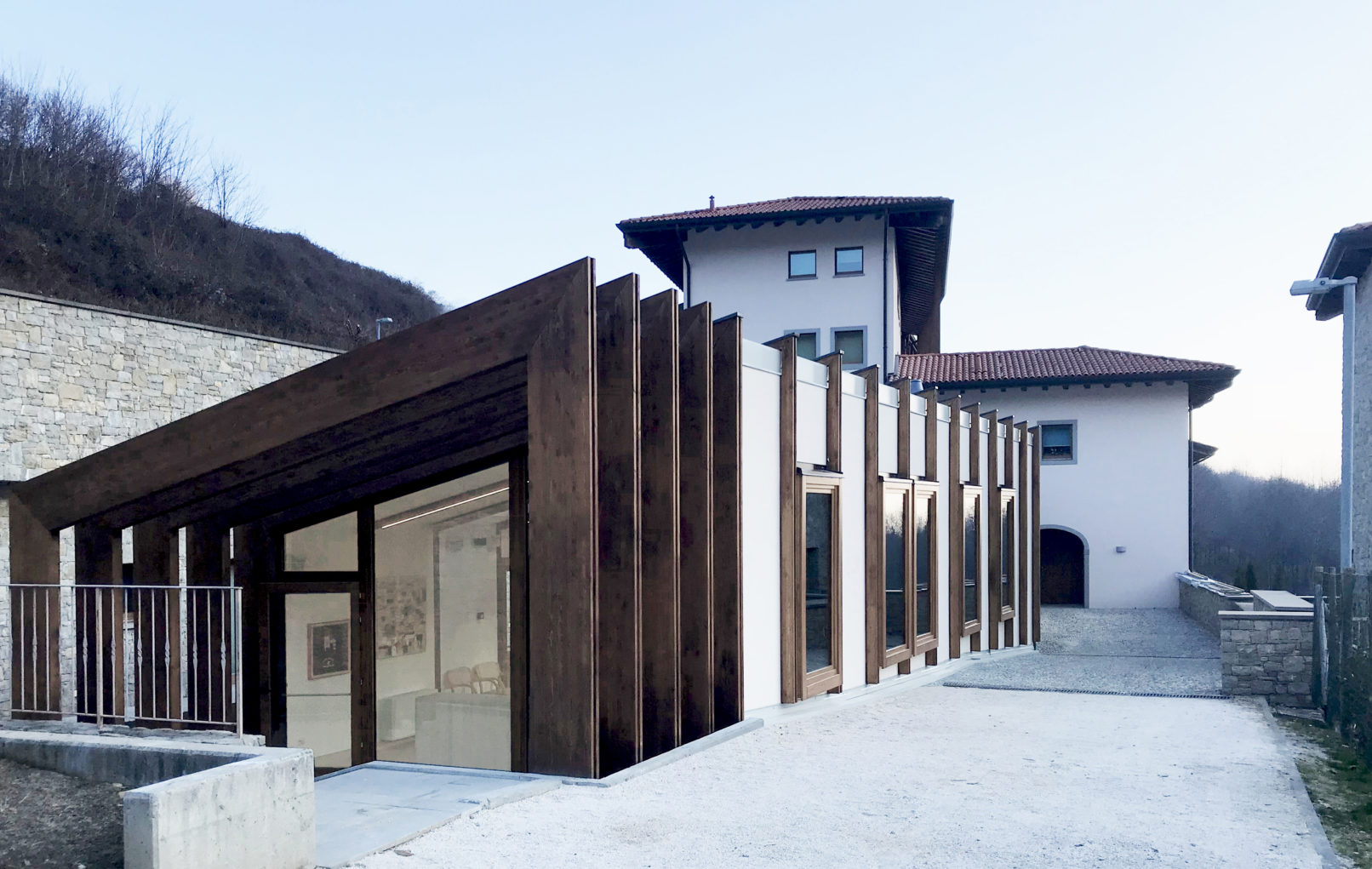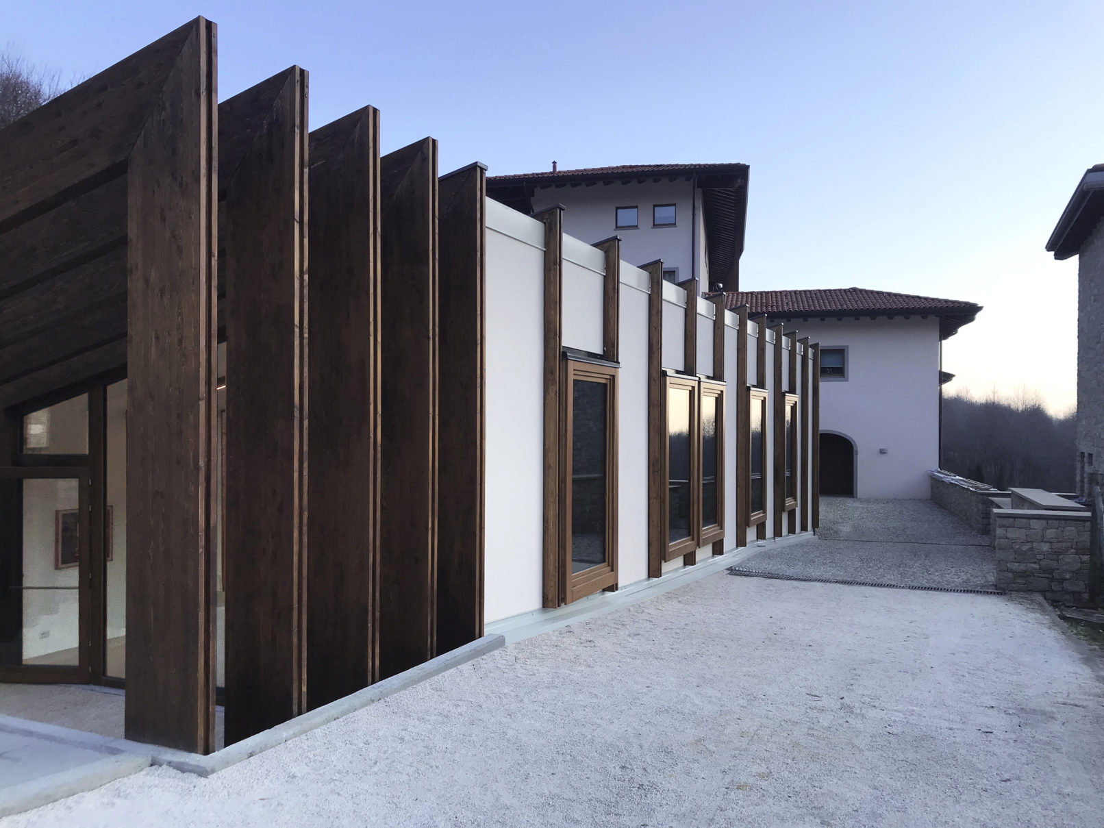 Il progetto prevede la realizzazione di un corpo di fabbrica in ampliamento alla struttura sanitaria esistente, ubicata in provincia di Bergamo in un contesto paesaggistico sottoposto a vincolo. L’esigenza di realizzare il nuovo volume, deriva dalla necessità di dotare l’attuale nucleo di degenza presente al piano terra, di ulteriori locali soggiorno. L’ampliamento è parte integrante di un progetto più generale di riorganizzazione funzionale di tutto il complesso, che si configura come una naturale prosecuzione del basamento. La struttura portante, caratterizzata dalla sequenza di portali in legno, genera la volumetria e definisce l’immagine del progetto, richiamando la tecnica costruttiva locale dei ballatoi. Il nuovo volume diventa così una grande veranda che grazie alla sua estensione pergolata e alle generose vetrate, stabilisce una relazione forte con il paesaggio.