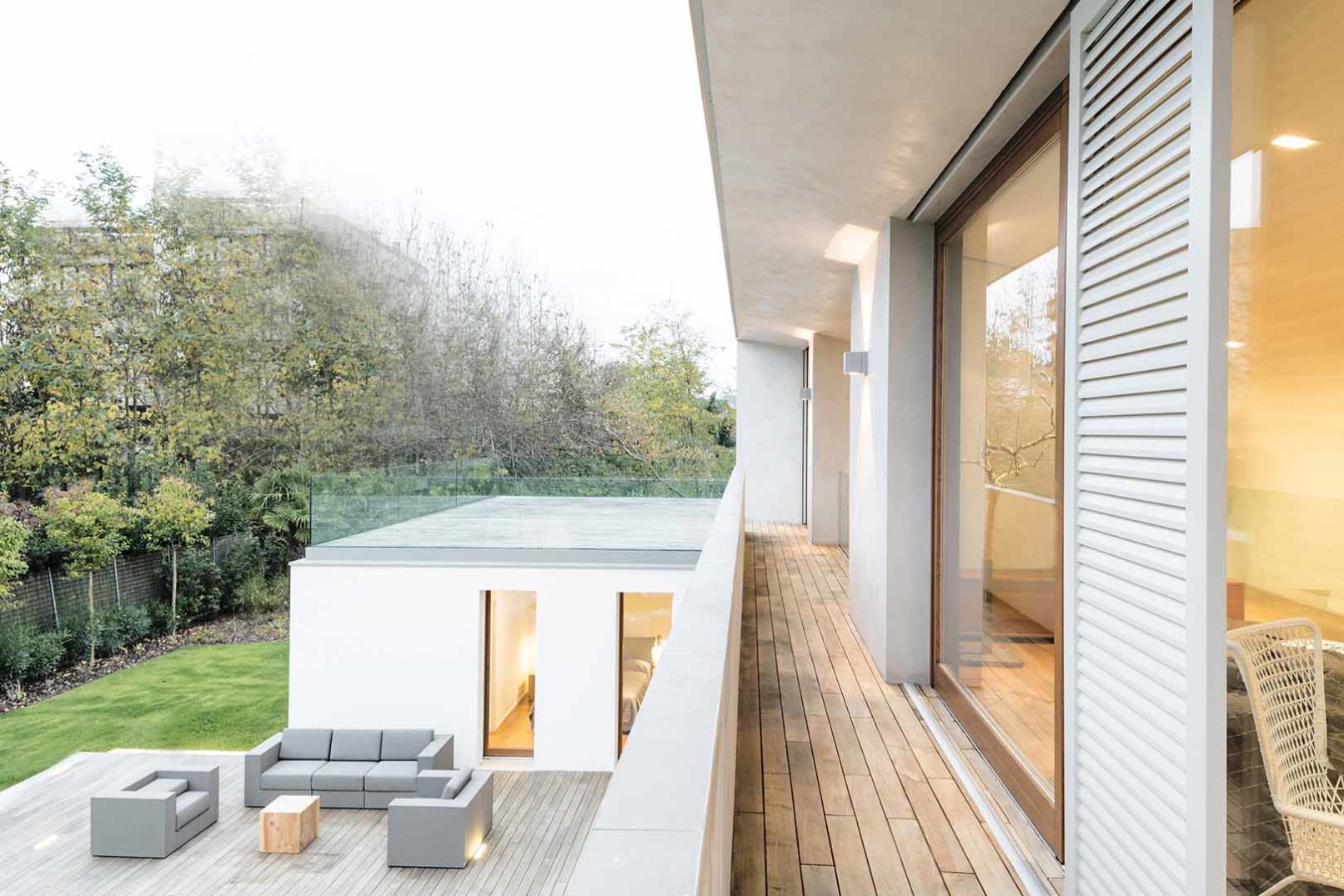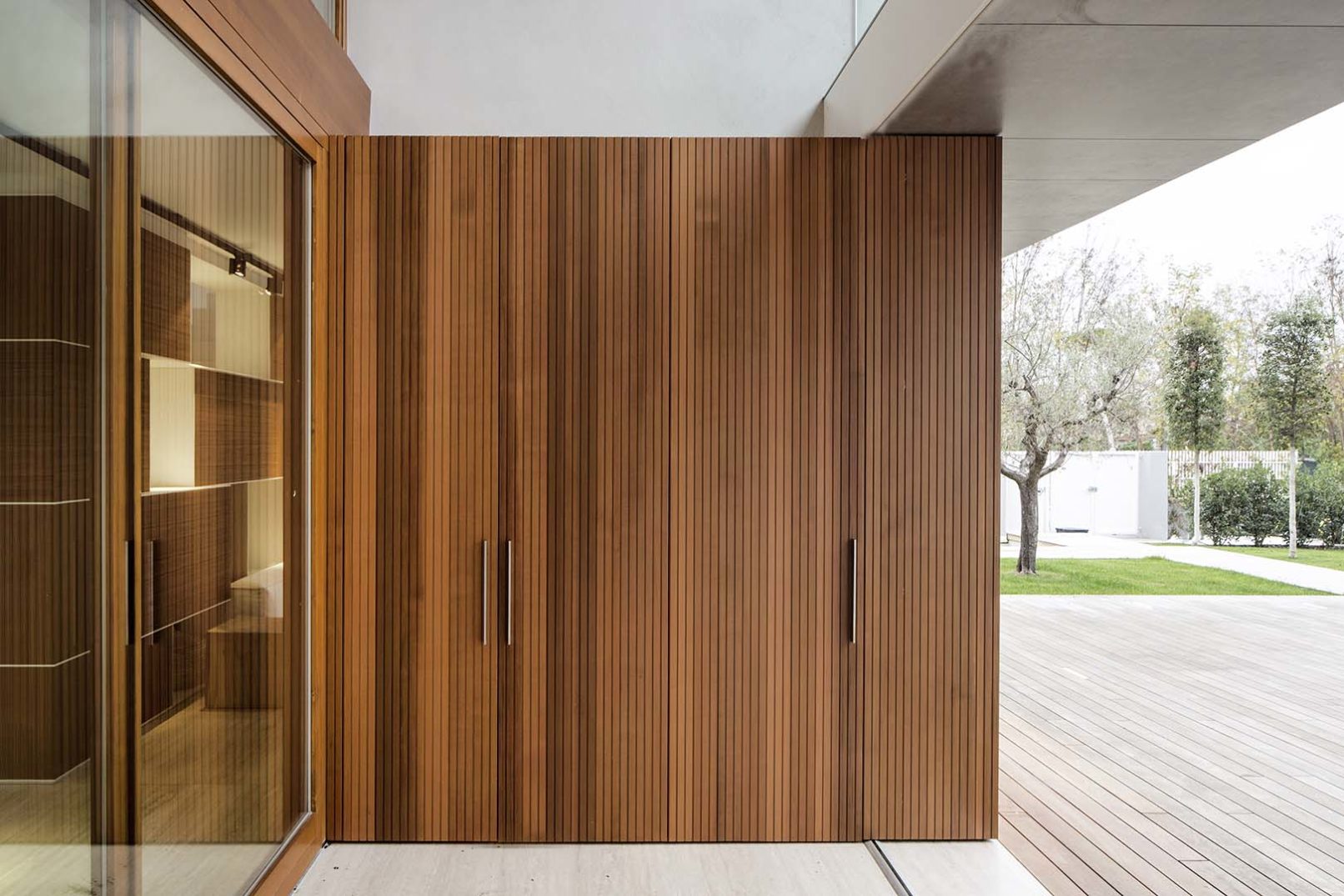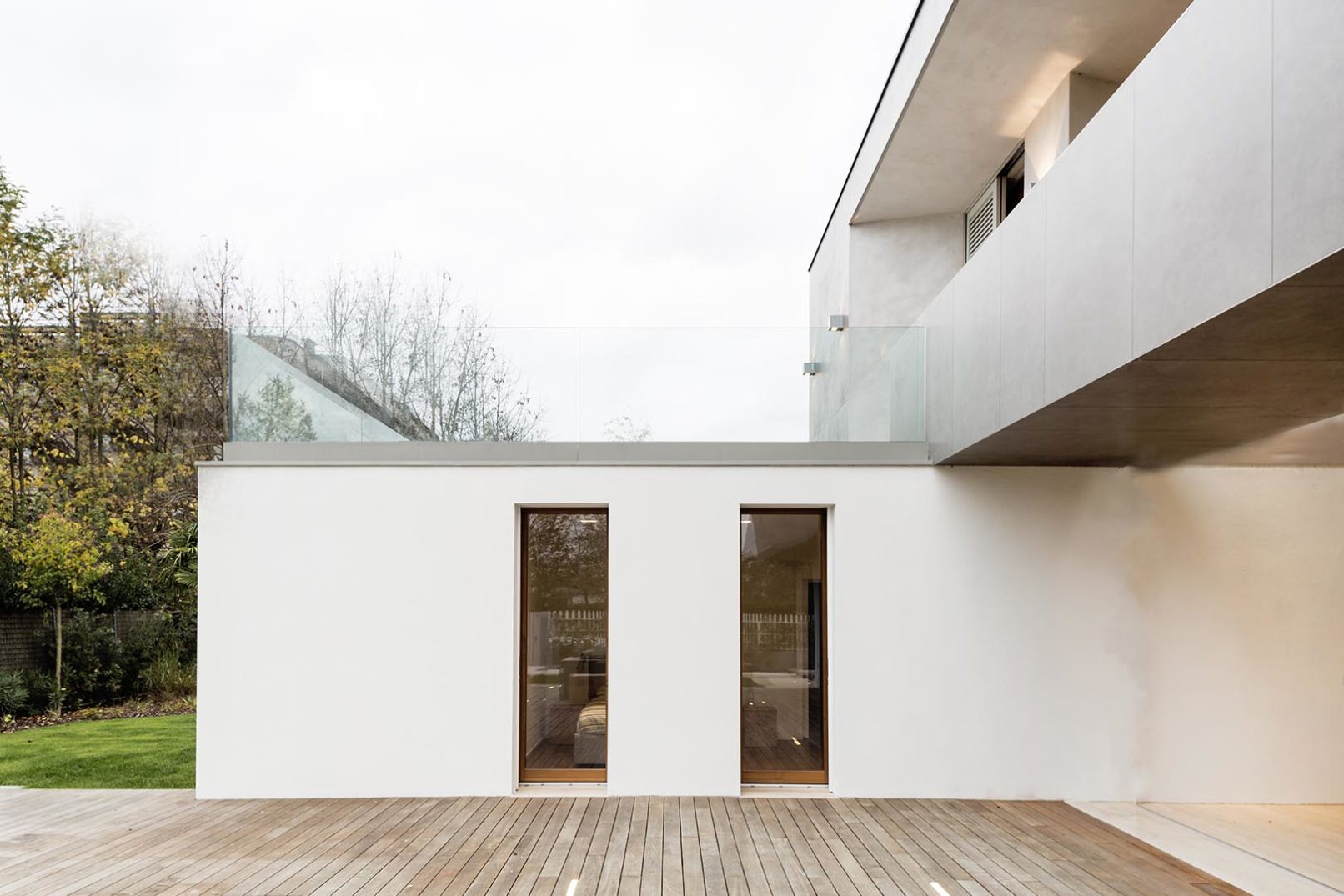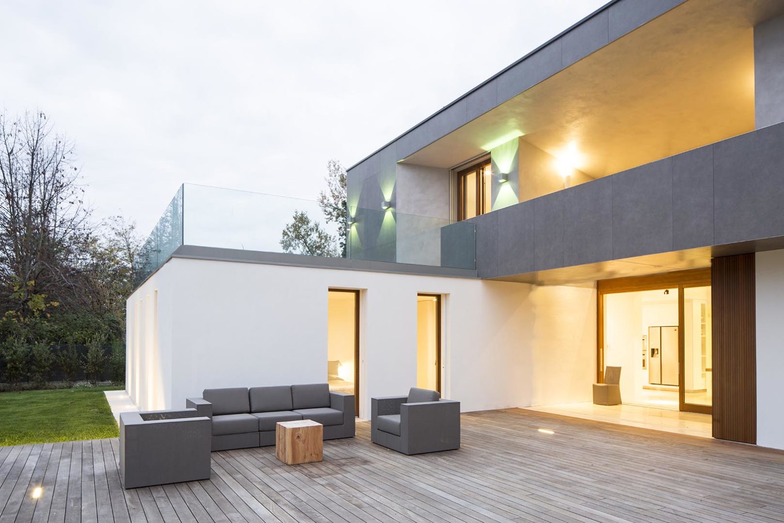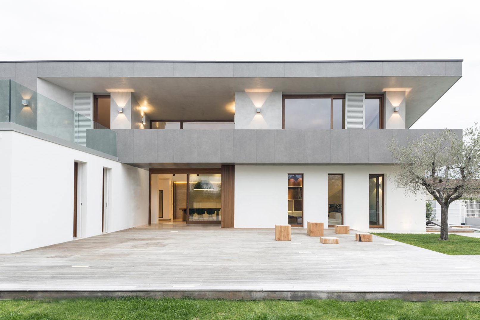 La casa è così organizzata su due volumi sovrapposti a differente vocazione; il primo, disposto ad elle intorno al patio di ingresso, ospita la zona giorno ed è identificato dalla finitura intonaco chiaro e dal ritmo ordinato delle finestrature; tale volume si spezza e si apre in prossimità dell’ingresso al fine di creare continuità con l’esterno e il giardino.