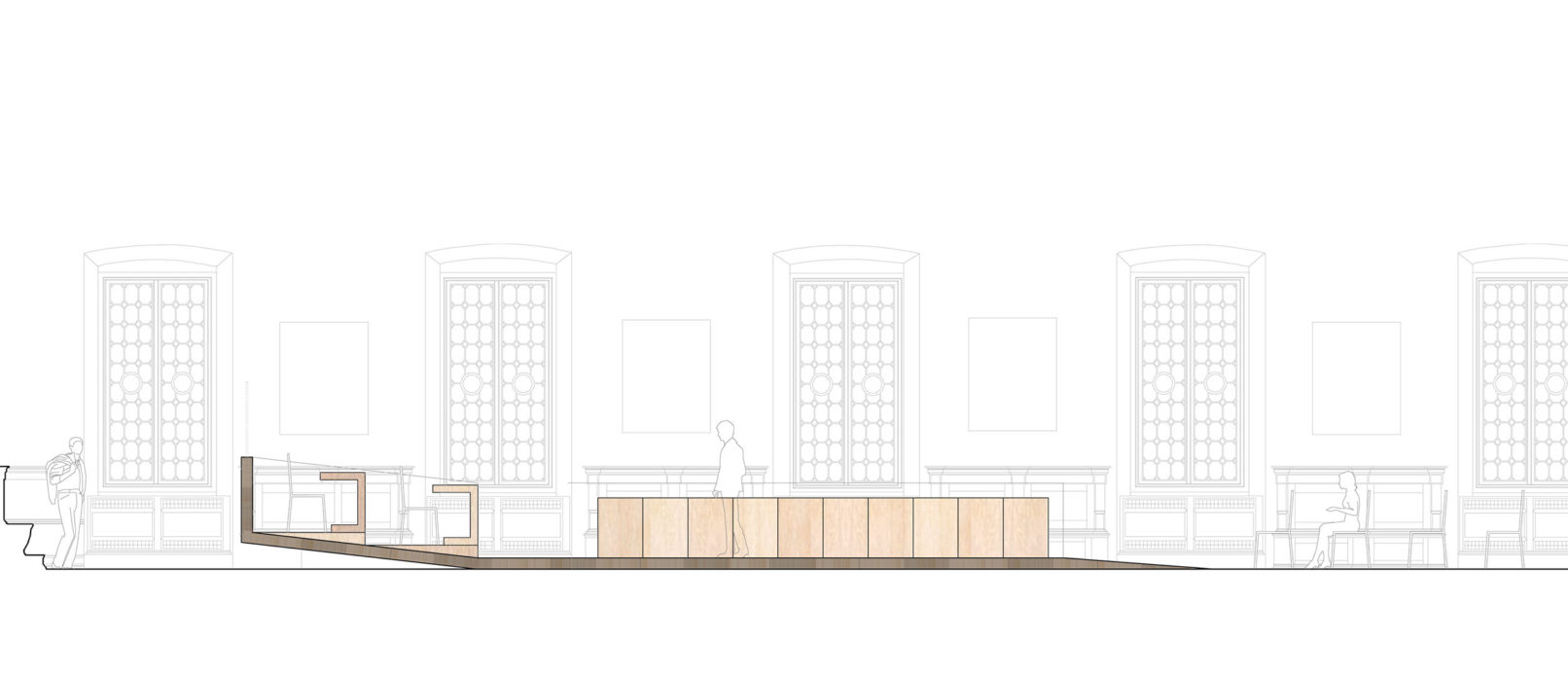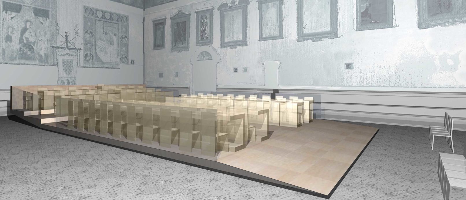 Il progetto per la trasformazione e il recupero della Sala Consiliare del comune di Prato tenta di risolvere problemi strettamente impiantistici e rigidamente funzionali con gesto unico: una sorta di grande “oggetto” immerso nello storico salone. Il progetto individua un’area d’intervento dentro la Sala Consiliare e vi sviluppa all’interno una superficie attrezzata e riconfigurabile. Una sorta di grande tappeto rialzato dal pavimento, che compatta le funzioni, tiene tutta l’impiantistica.